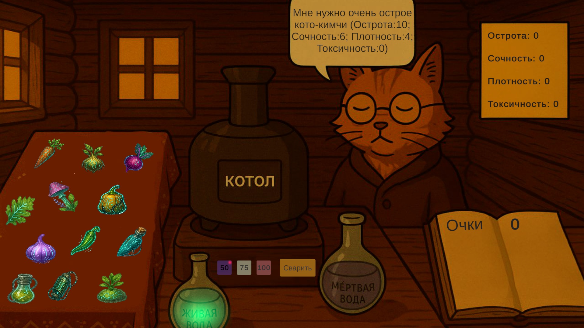Ваша цель - набрать много очков, для этого нужно варить зелья с такими характеристиками, которые будут максимально приближёнными к заказу клиента!